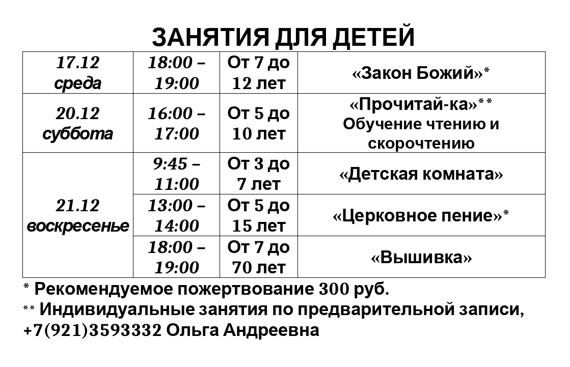 11.12 среда 18:00 «Закон Божий»* (5-10 лет). Руководитель Наталия Сергеевна Яковлева. +7(911)9855659